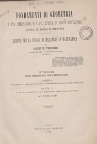 Giuseppe Veronese, Fondamenti di Geometria a più dimensioni e a più specie di unità rettilinee, esposti in forma elementare. Lezioni per la Scuola di Magistero di Matematica, Tipografia del Seminario, Padova, 1891, pp. XLVIII, 630.